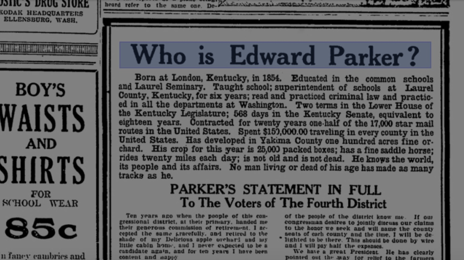 Edward Parker was born to Felix and Eliza Jane Lincks Parker on October 30, 1856 in Laurel County, Kentucky. He died in Yakima, Washington on April 16, 1926. (Source: Ancestry.com)